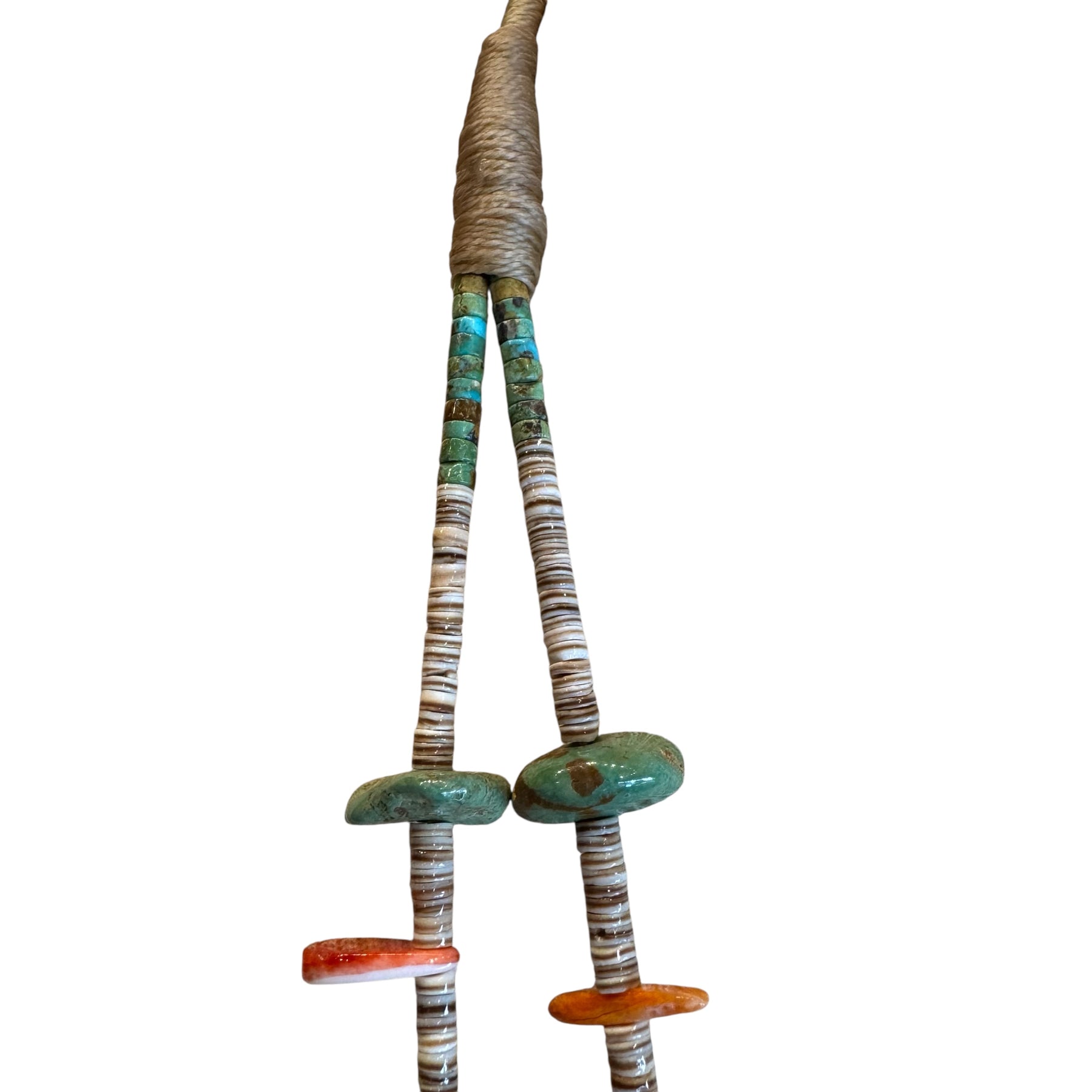 - Materials: Brown Heshi shell, Orange Spiny, Red Spiny, Turquoise Heshi shell, Yucca Plant- tradition wrap