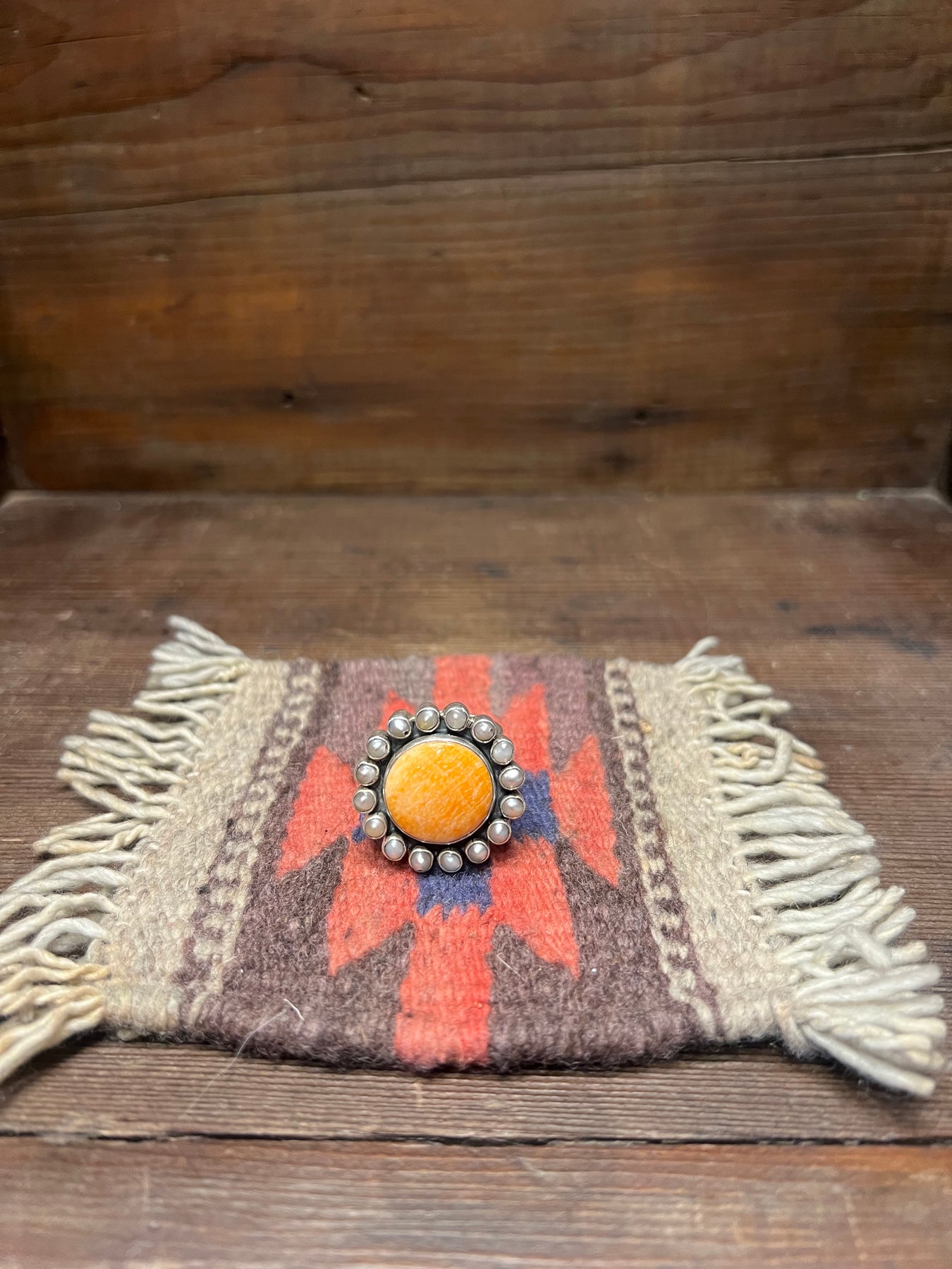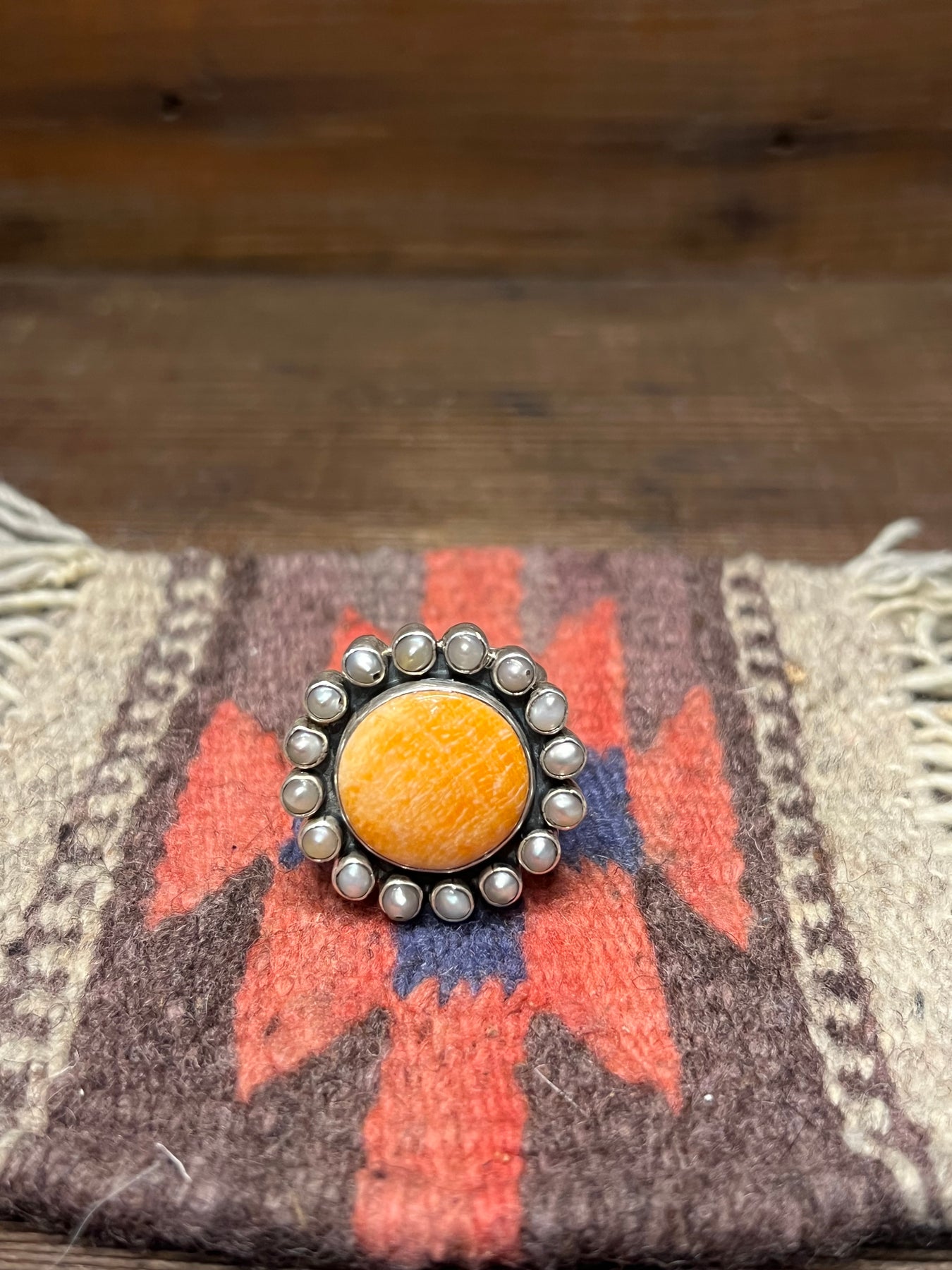 Orange Spiny & Fresh Water Round Cluster Adjustable Ring Dimensions: 1-1/4”W x 1-1/4”L   Artist: Federico