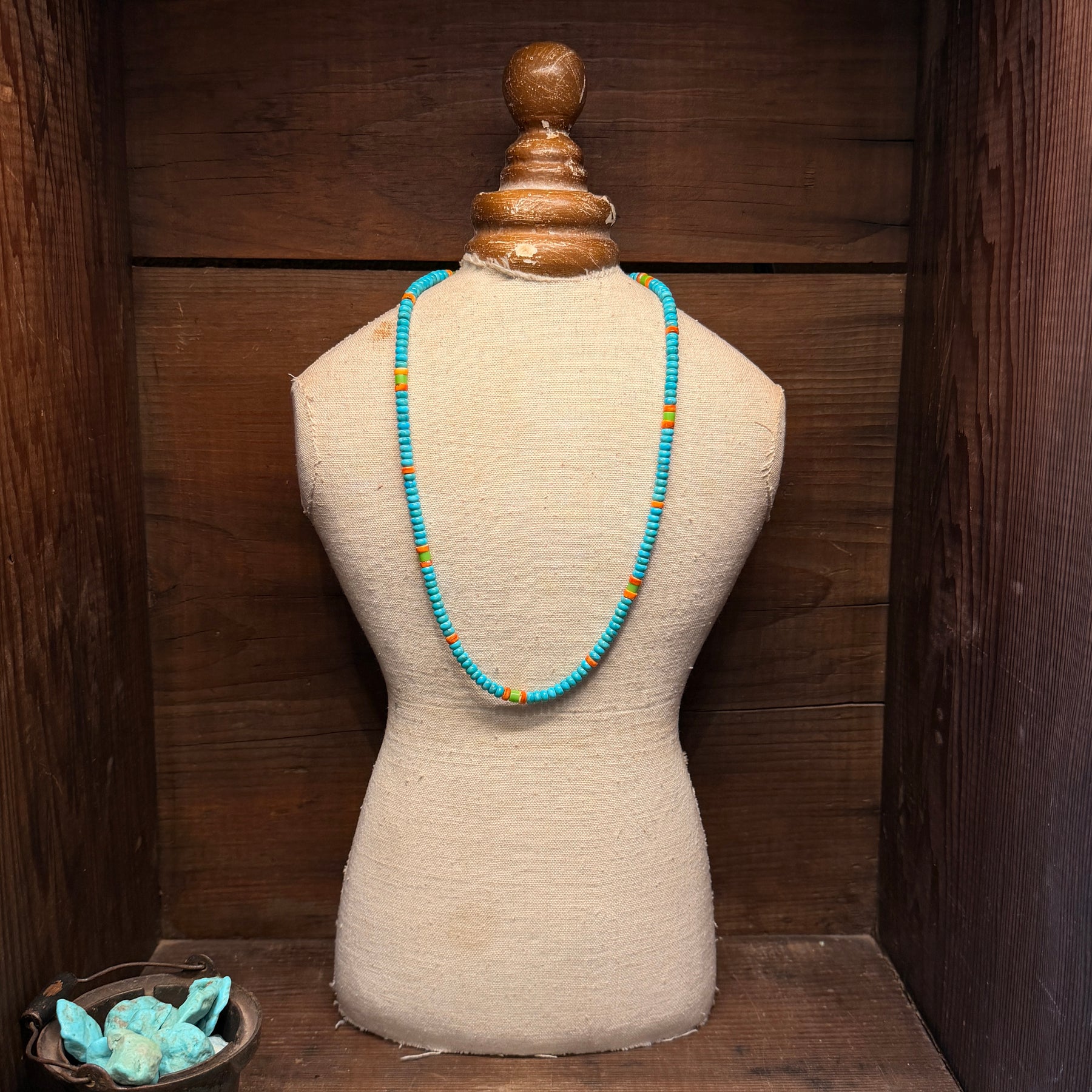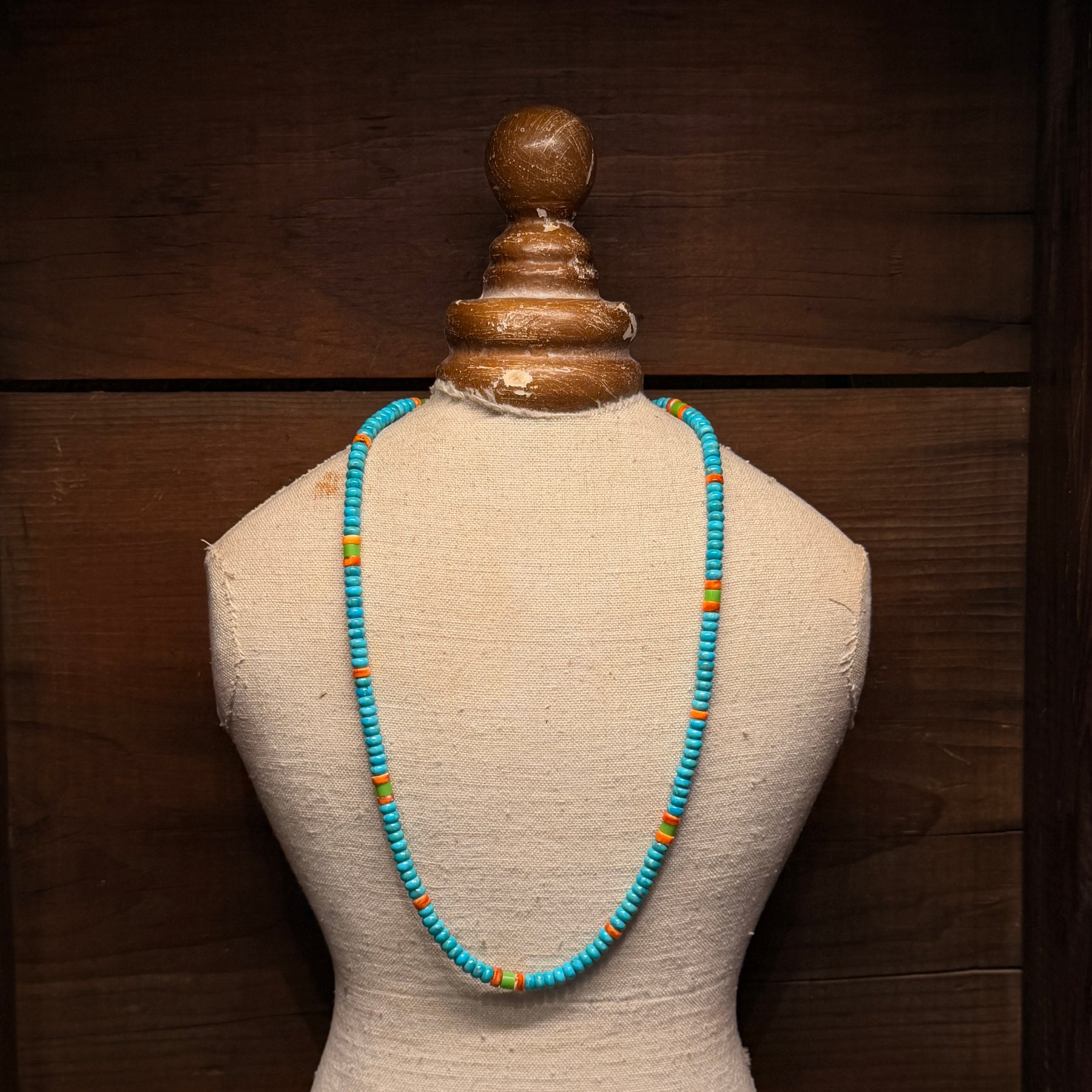 This handcrafted necklace features smooth turquoise beads accented with warm spiny oyster shell and distinctive Gaspeite beads, creating a vibrant Southwestern color palette of blue, orange, and earthy green tones. The alternating accents add rhythm and visual interest while keeping the design clean and wearable.