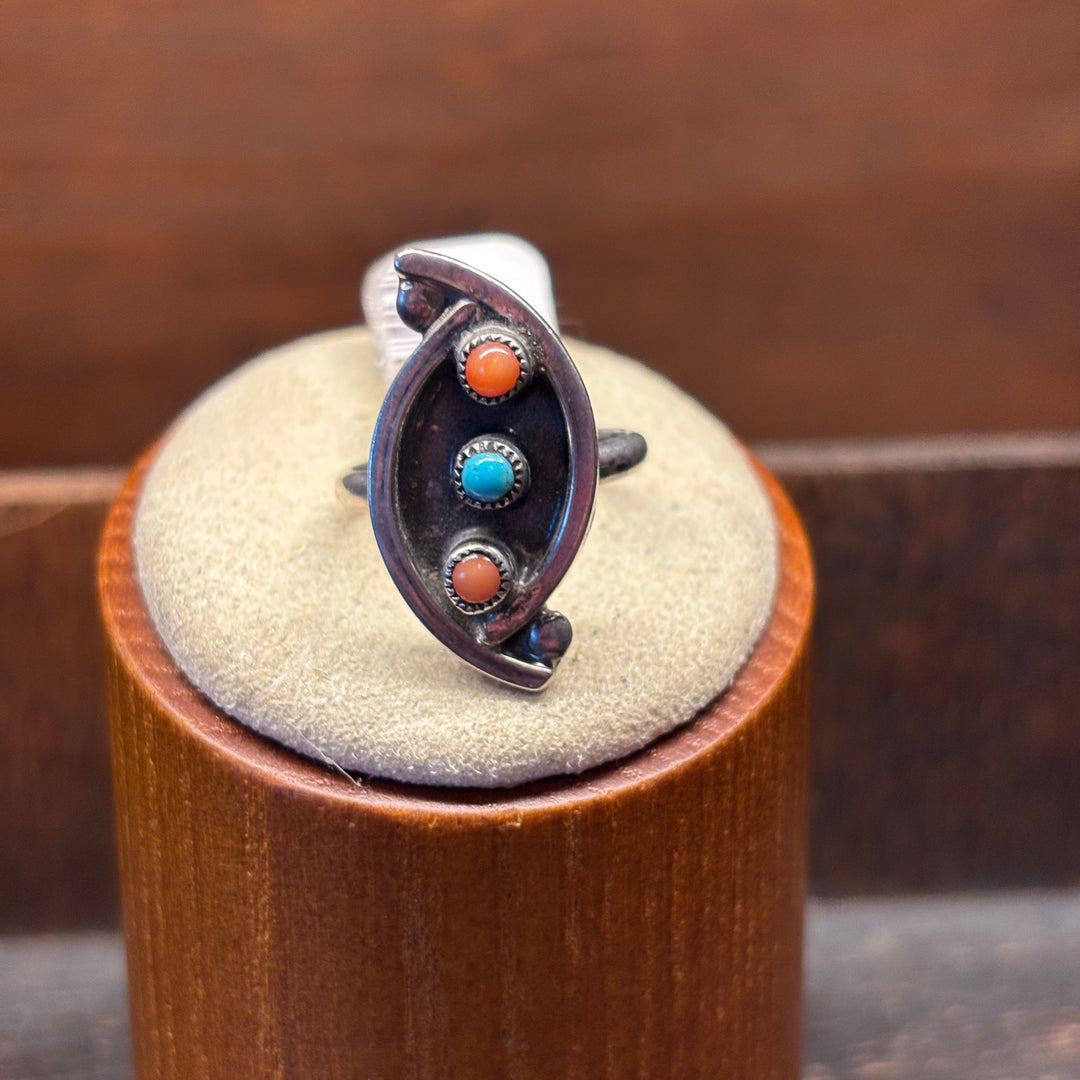 Angel Coral and Arizona Turquoise 1 Long Vintage 1970's Sterling Silver Ring Size 6.75