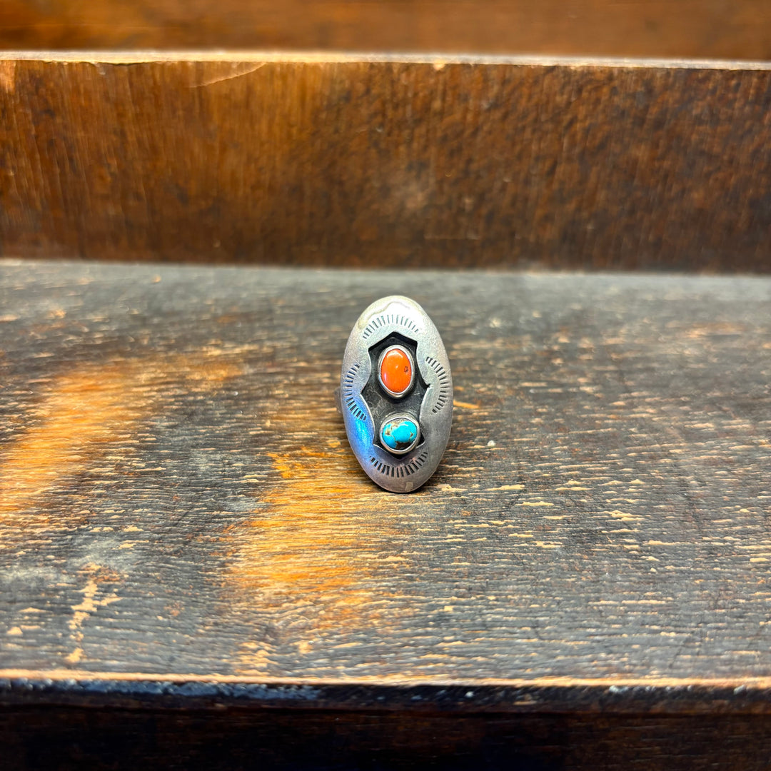 Chip Inlay Mixed Nevada Turquoise and Coral Vintage 1970's Ring