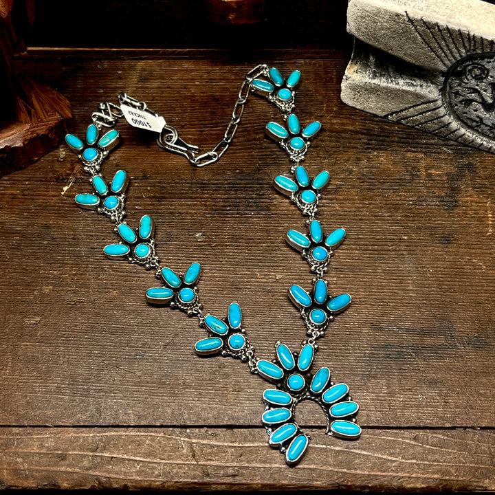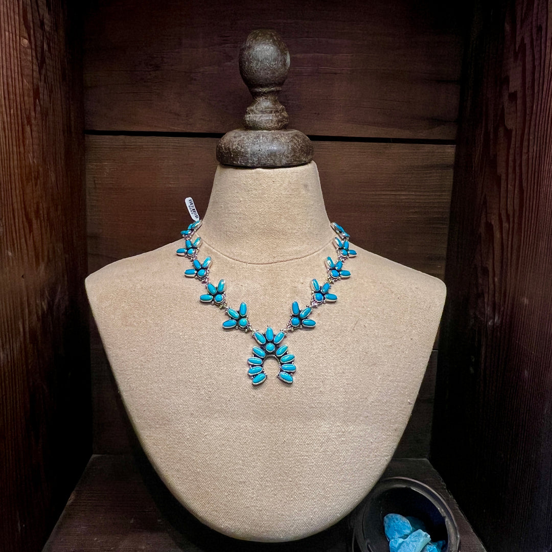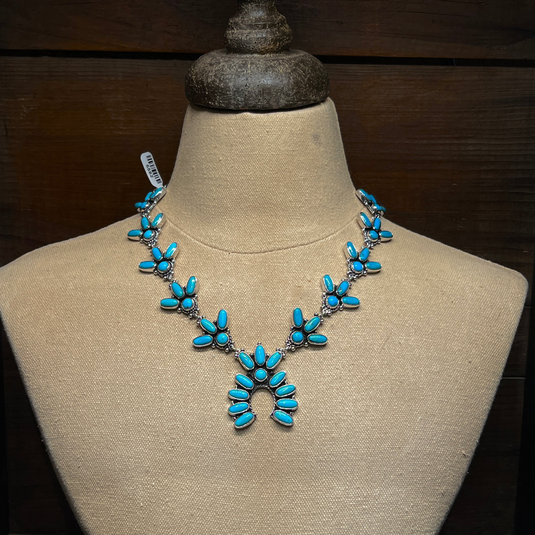 • Ten sterling silver bezel set turquoise oval cabochon squash blossoms